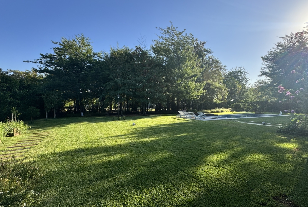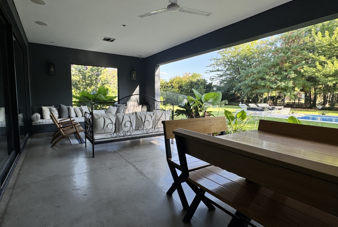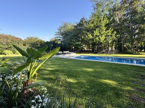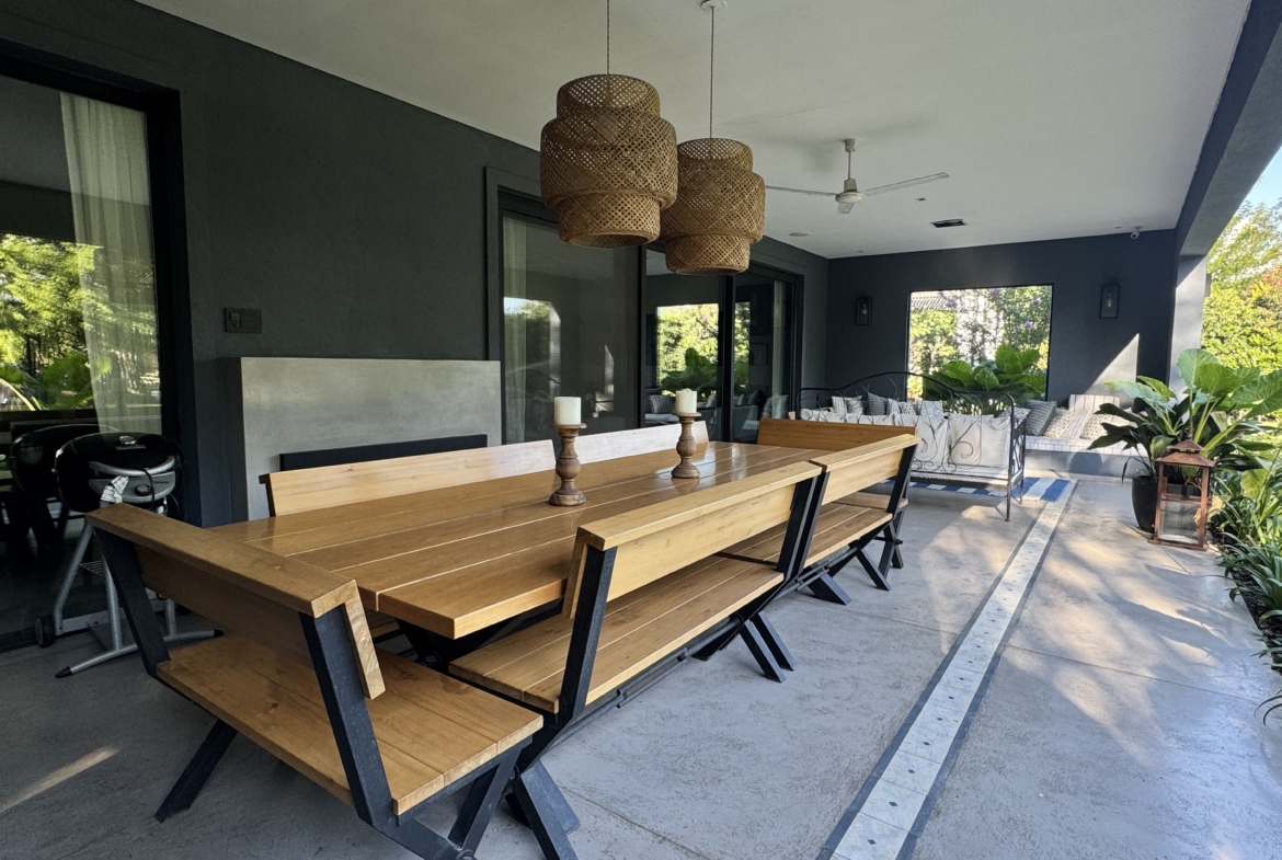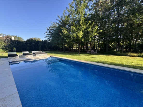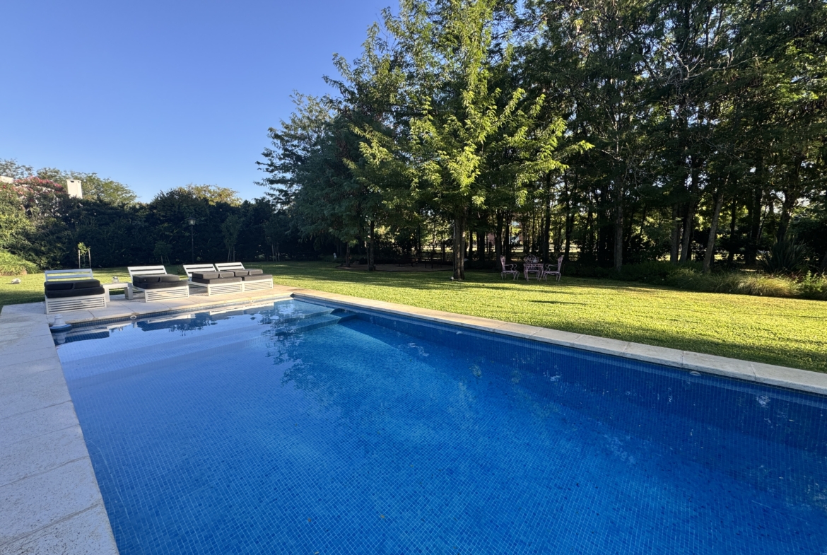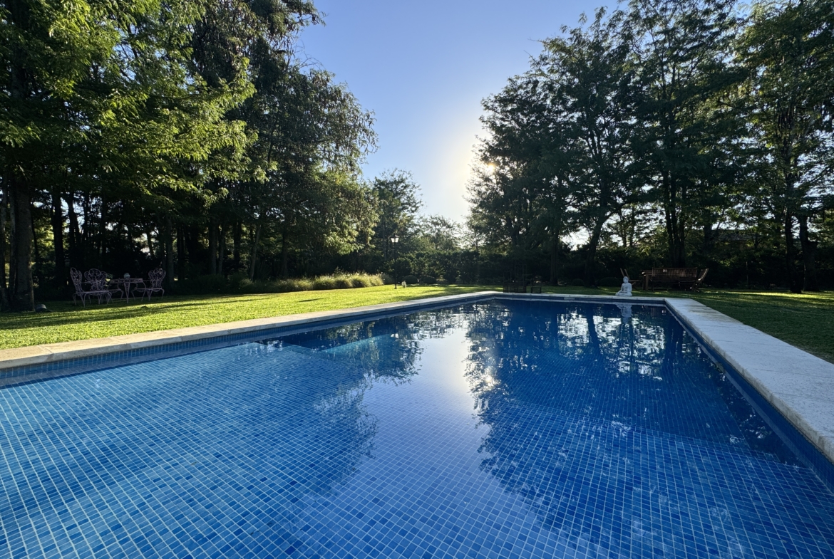 En el exterior, el jardín se presenta totalmente parquizado sobre un amplio lote interno, generando un entorno de gran privacidad. La galería con parrilla invita a disfrutar reuniones al aire libre, acompañada por una gran piscina revestida en venecitas y un atractivo sector de fogonero que completa un espacio pensado para disfrutar todo el año.