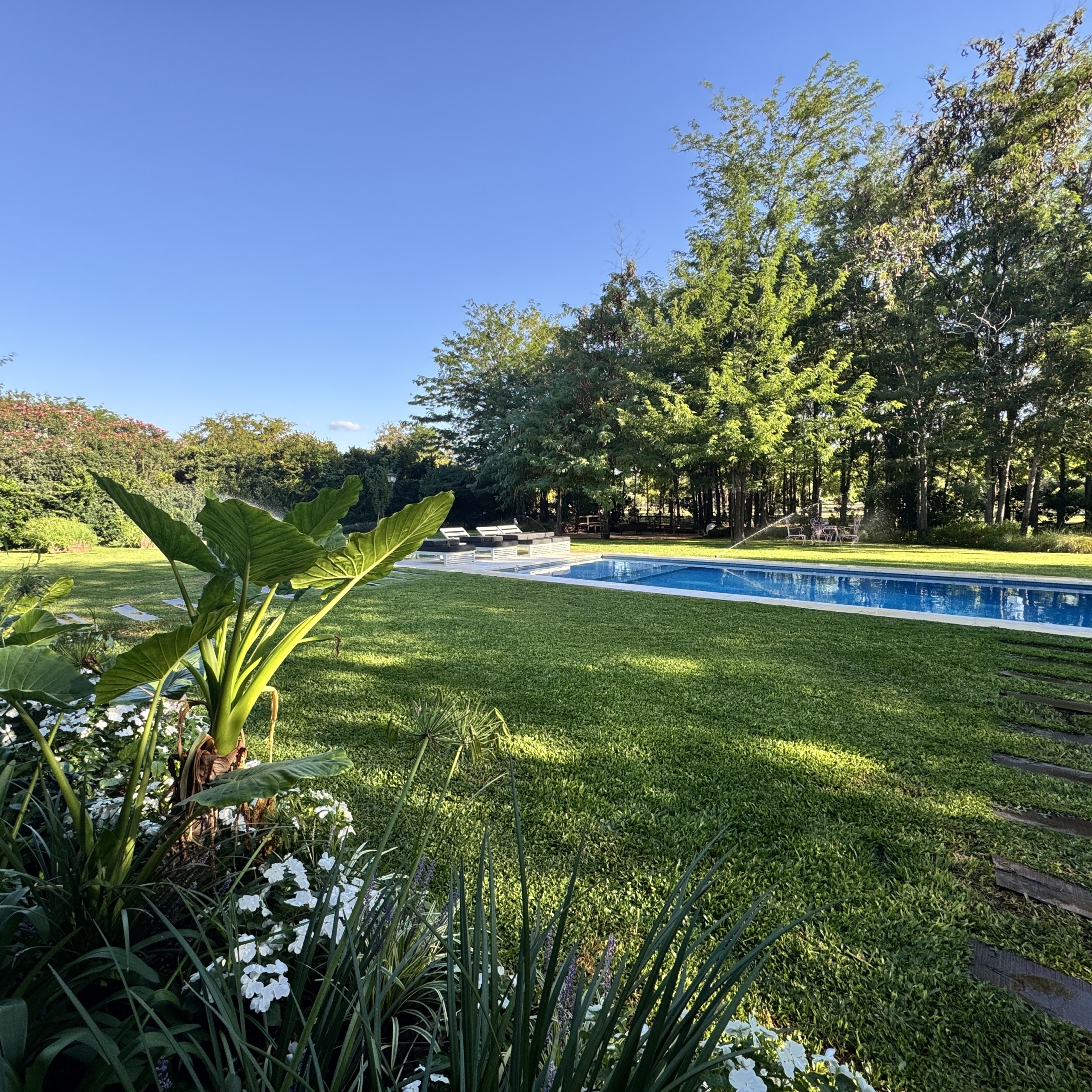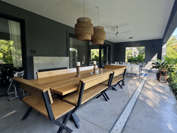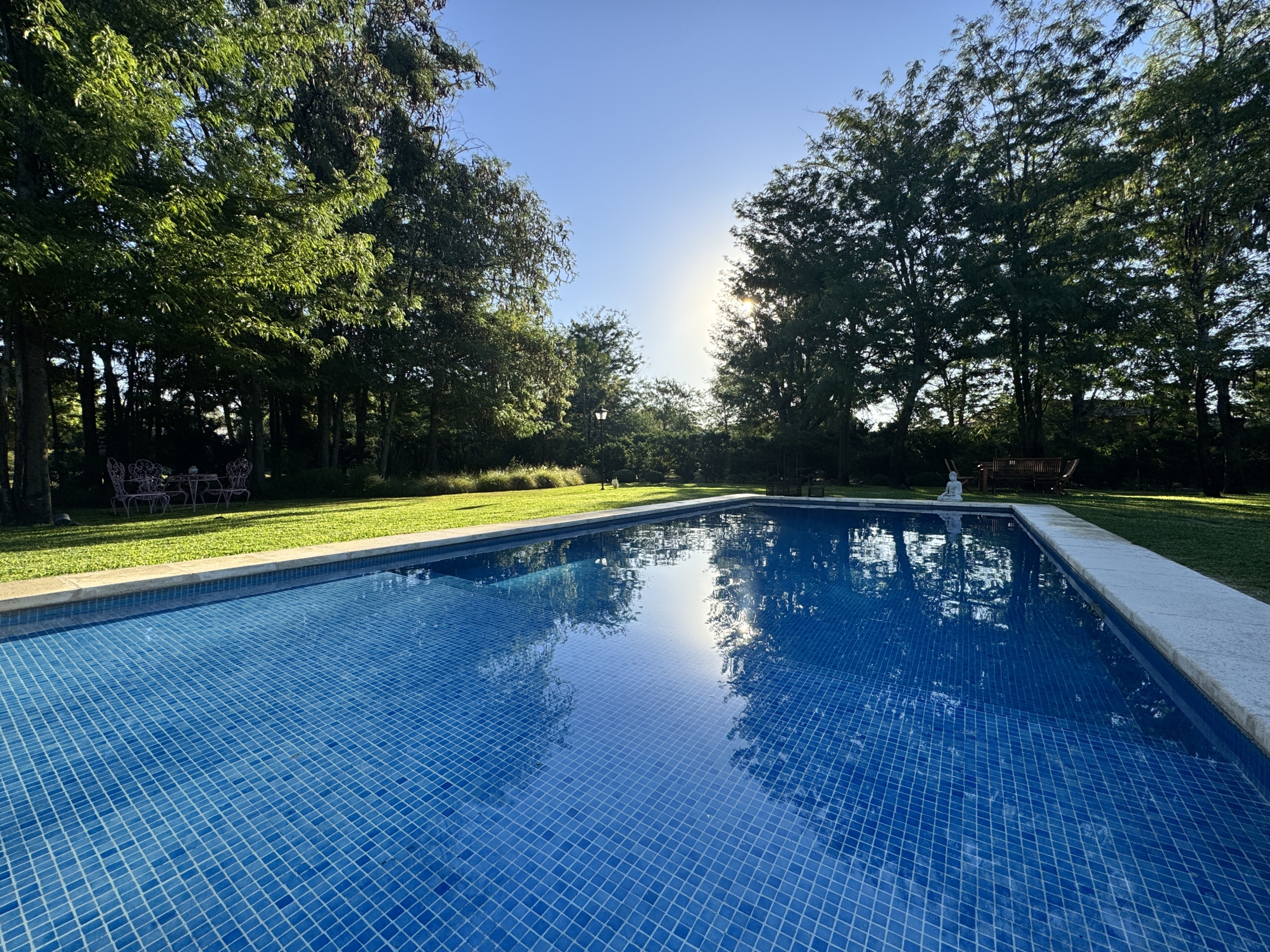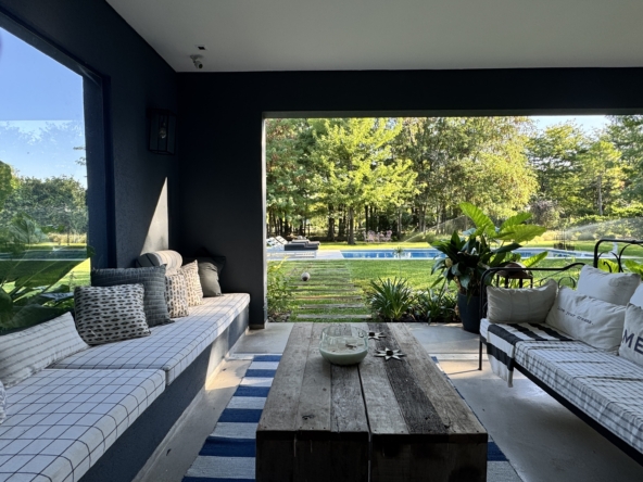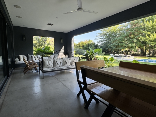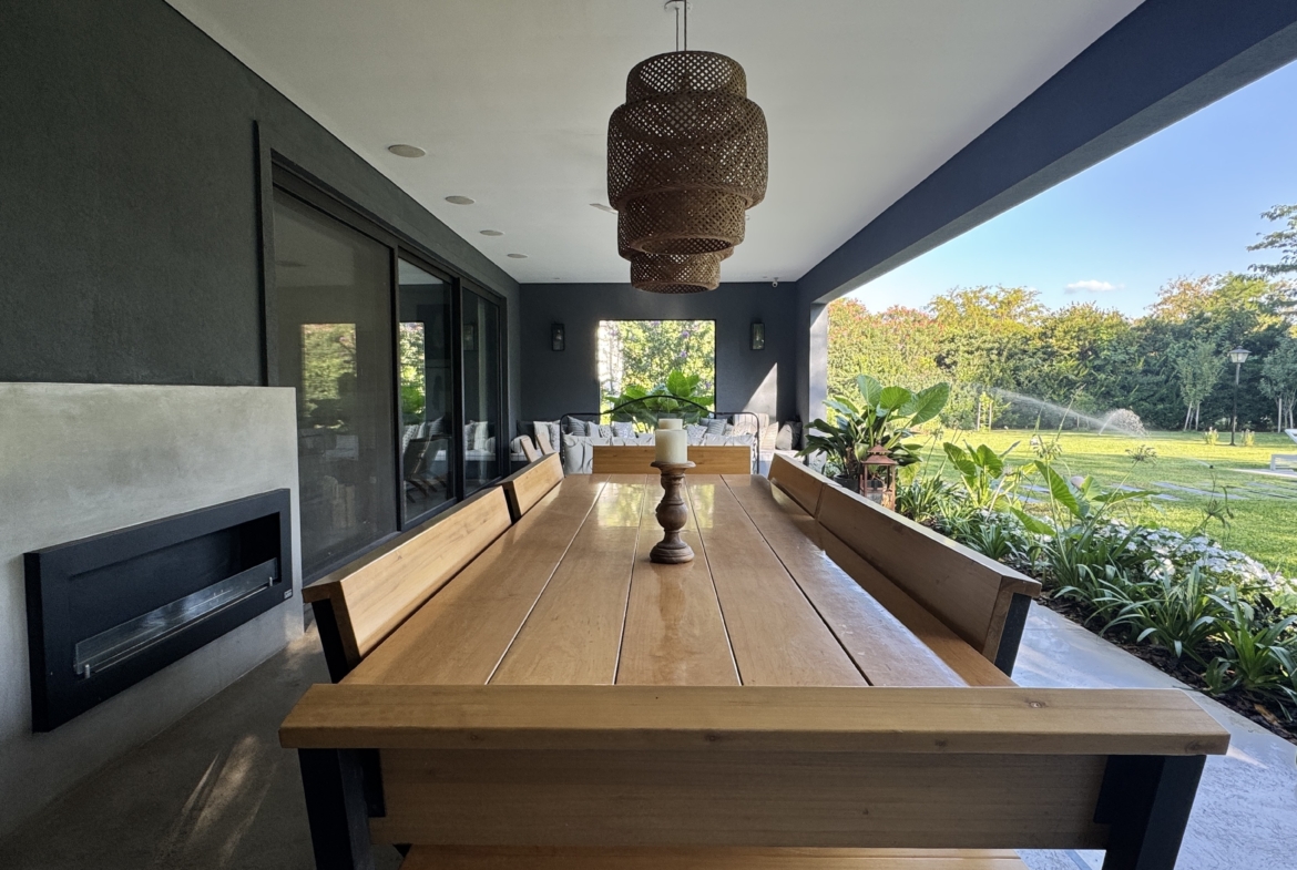 En el exterior, el jardín se presenta totalmente parquizado sobre un amplio lote interno, generando un entorno de gran privacidad. La galería con parrilla invita a disfrutar reuniones al aire libre, acompañada por una gran piscina revestida en venecitas y un atractivo sector de fogonero que completa un espacio pensado para disfrutar todo el año.