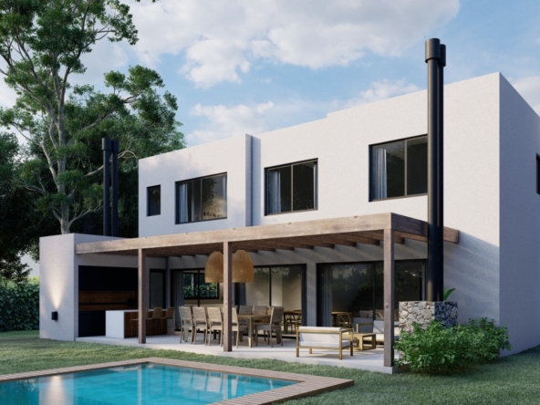El área exterior ofrece una galería con parrilla, living exterior con hogar y baño exterior, ideales para disfrutar reuniones y momentos al aire libre. El jardín se encuentra parquizado y cuenta con pileta de 8 x 4 metros. Dispone además de garage semicubierto.